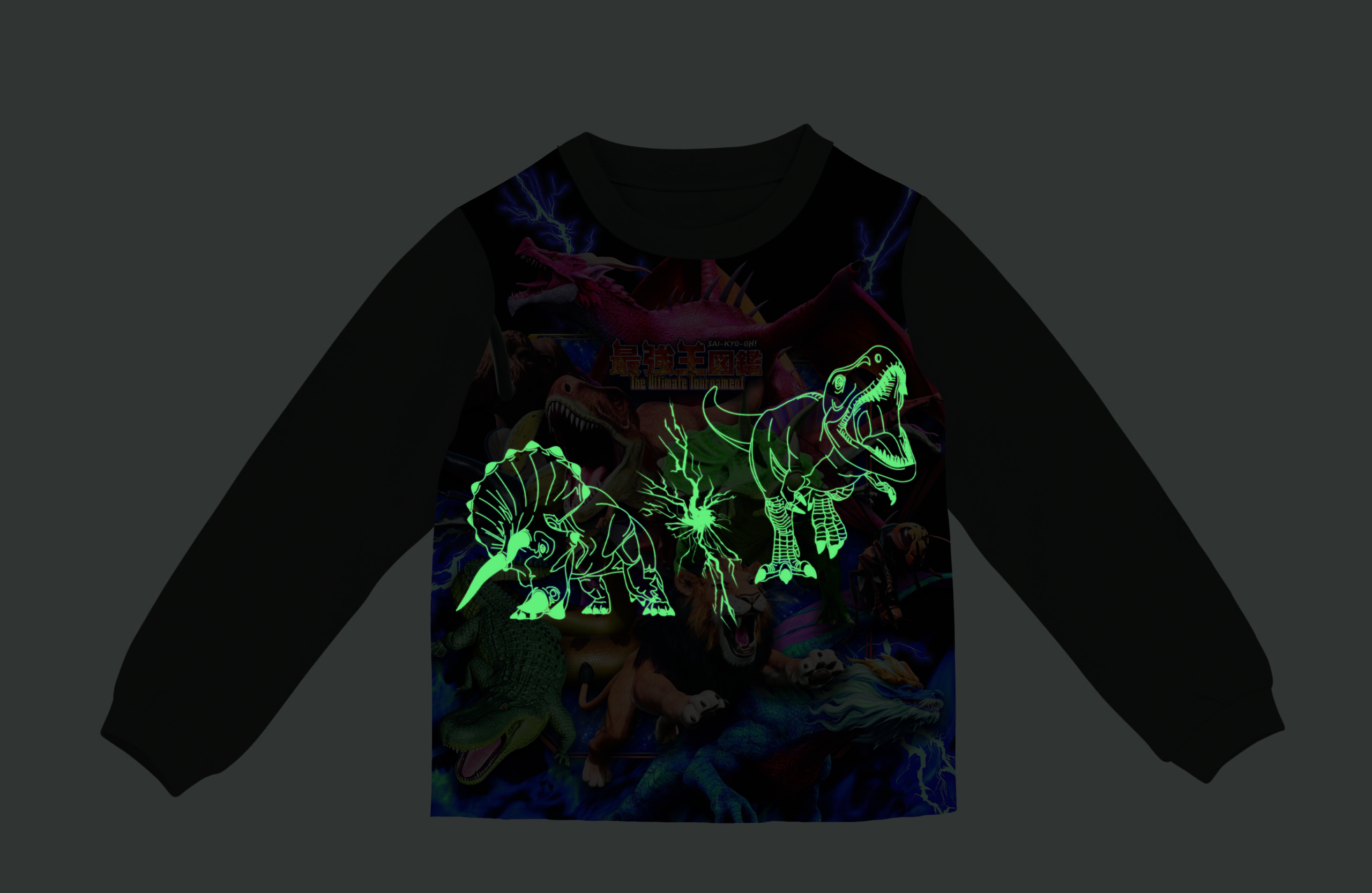 「最強王図鑑」の光るパジャマが登場!暗闇の中で恐竜が光ります。裏起毛なので、肌触りがよく、最強王図鑑に出てくる生物たちと一緒に眠ることができます。